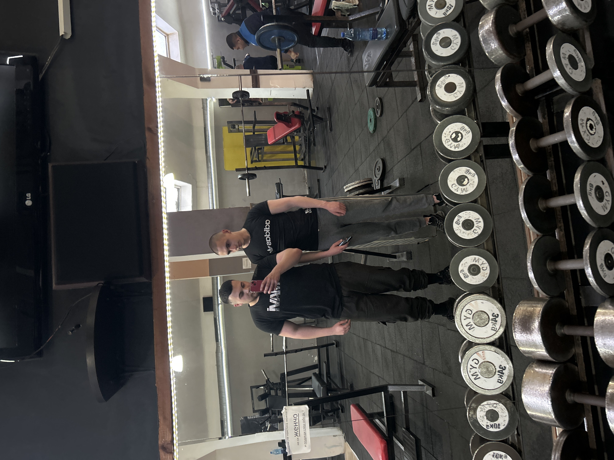 Here is a matter-of-fact description of the image: The image appears to be a mirrored shot taken inside a gym, likely in the city of Vratsa, Bulgaria, based on the Cyrillic text on the weights and a sign. Two men stand in front of the mirror, with the foreground man holding a cell phone as if taking a selfie or a photo of the reflection. He wears a dark t-shirt and dark pants. The man behind him is also wearing a dark t-shirt and gray pants. The men are Caucasian and have short hair. In the background, other gym patrons can be seen, including one person using a weight machine. Exercise equipment such as weight benches, barbell racks, and a rack of dumbbells are visible throughout the gym. The rack of dumbbells is prominently placed on the right side of the image, showcasing various weights. There is a television mounted on the wall to the left of the mirror. The lighting in the gym is provided by fluorescent lights on the ceiling and decorative LED lights around the mirror frame. A sign with Cyrillic text is visible on a piece of equipment in the foreground. The floor is a dark, tiled surface.