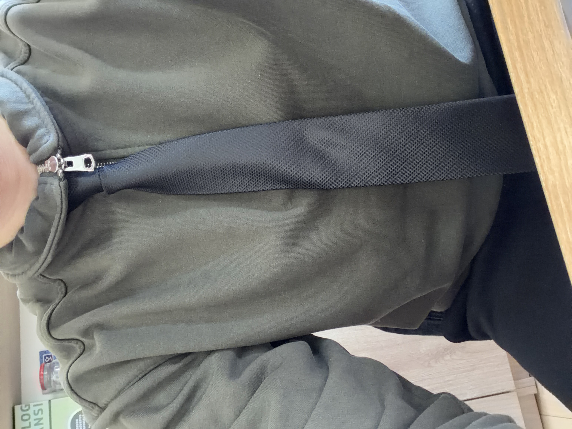 A person is wearing an olive green zippered jacket with a black strap across the front. The jacket has a ribbed collar. Black pants are visible on the right side of the image. The setting appears to be indoors with a wooden table to the right and shelving with various items partially visible on the left. There is no information to suggest the photo was taken in Panagyurishte, Bulgaria.