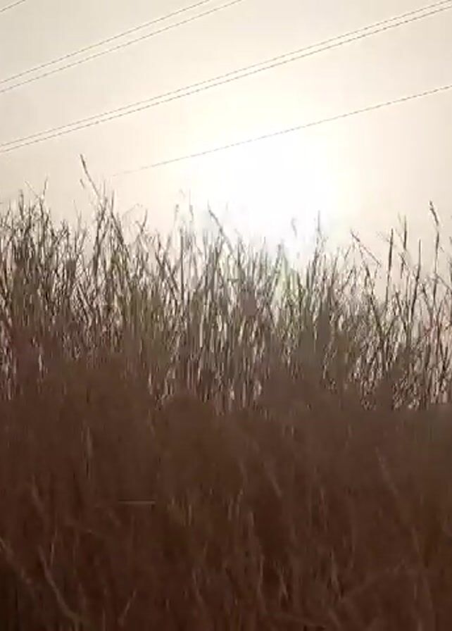 tall brown grass blowing in the wind against a hazy, bright sky. Power lines stretch across the top of the frame. The sun is obscured by the haze, but its bright light is still visible behind the grass. The camera is low to the ground, giving a perspective from within the grass.