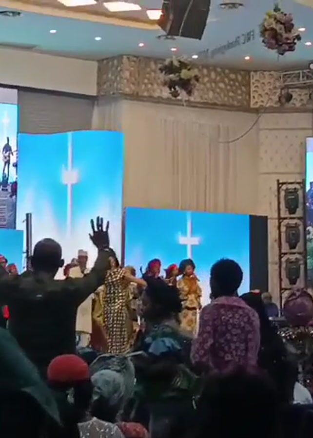 group of people on stage in a large, ornate hall with a crowd in front of them. The hall has a stage area with several LED screens showing the group on stage and a backdrop with large white crosses. The ceiling is high and decorated with lights, speakers, and floral arrangements. There is a camera boom to the left of the stage. The people on stage are dressed in colorful clothing and appear to be singing or performing. The people in the crowd are also dressed in various outfits, with some raising their hands. The atmosphere seems celebratory and energetic.