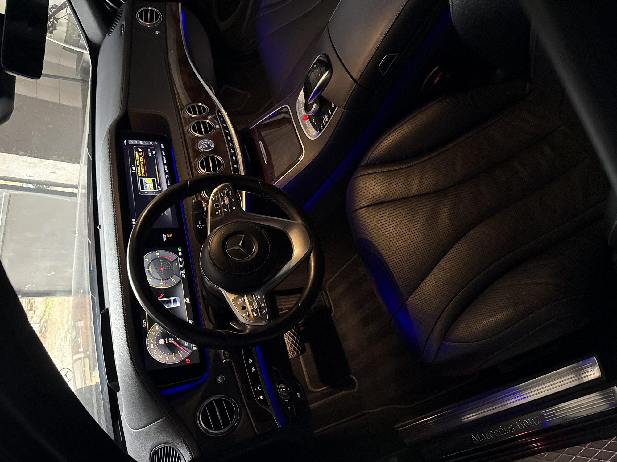 The image displays the luxurious interior of a stationary Mercedes-Benz vehicle, specifically the driver's cockpit, located in Cherven Bryag, Bulgaria