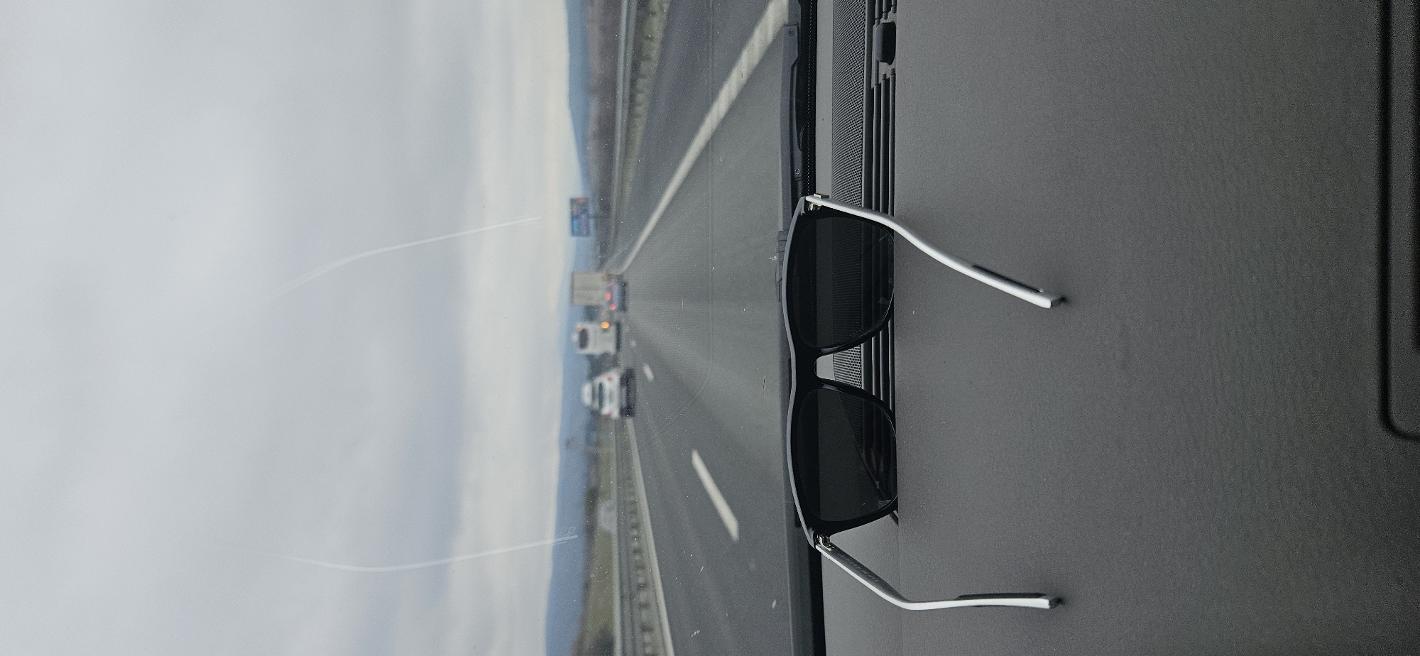 pair of sunglasses resting on a dark, textured surface, likely the dashboard of a car. Through the car window, a highway scene is visible, with multiple vehicles in the distance. The sky is overcast and hazy. The road appears to be divided into several lanes. Based on the presence of a highway and surrounding terrain, the location is consistent with a highway outside of Vakarel, Bulgaria, although positive confirmation using only the provided image is not possible.