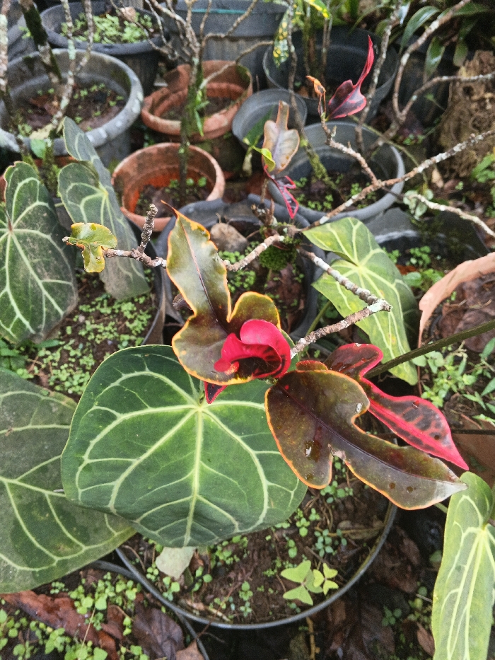 This image depicts a close-up, top-down view of a collection of potted plants located outdoors in the city of Unknown, Vietnam. The scene foreground is dominated by two primary plant types. To the left, several large, dark green leaves with prominent light green reticulated venation, consistent with an Anthurium species, are visible, partially overlapping. To the right, a plant with irregularly shaped leaves exhibits varied coloration, including dark green, brown, and vibrant red-pink, particularly in its inner or younger foliage, indicative of a Croton species. A bare, light-colored branch structure extends horizontally from this plant. In the background, numerous plant pots, ranging in color from dark grey and black to terracotta, are densely arranged, containing soil, small green sprouts, and various other plants or bare woody branches. The soil within and around the pots appears damp, and some leaves show residual water droplets, suggesting recent watering or rain. No people, animals, or explicit actions are present in the static environment, which resembles a garden or plant nursery setting.