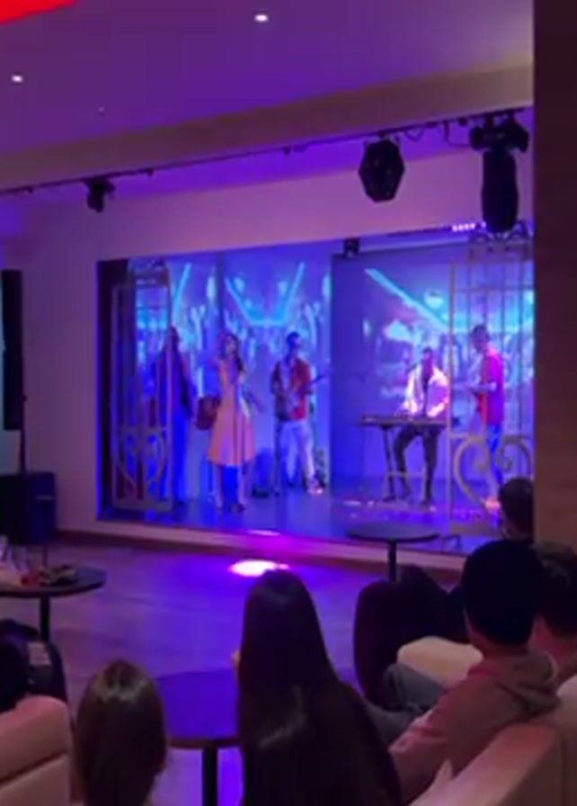 band performing on a stage in a lounge or bar area. The stage is framed by a large window and lit with blue and white stage lights. There is a female vocalist, a guitarist, a keyboardist, and possibly other musicians on stage. In the foreground, several people are sitting on white couches, watching the performance. There are small tables with drinks on them. The walls are paneled with light brown wood. The lighting in the room is dim, with red accent lights on the ceiling.