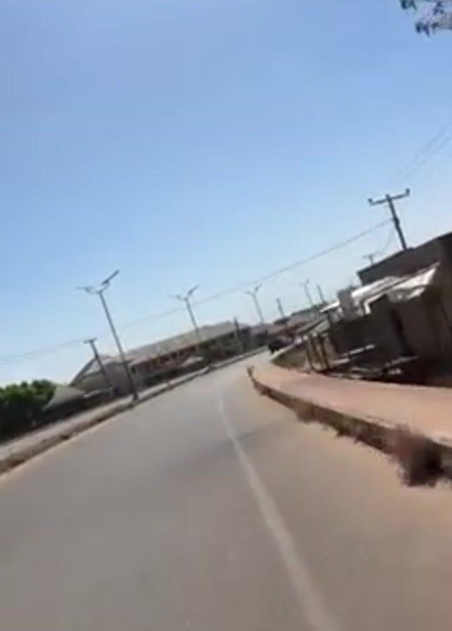 first-person perspective of someone riding a motorcycle on a paved road. The road is lined with streetlights on one side and a sidewalk with some trees and buildings on the other. There are a few cars driving in the distance, and a person walking on the sidewalk. The sky is clear and blue. The motorcycle rider's hand can be seen on the right handlebar.