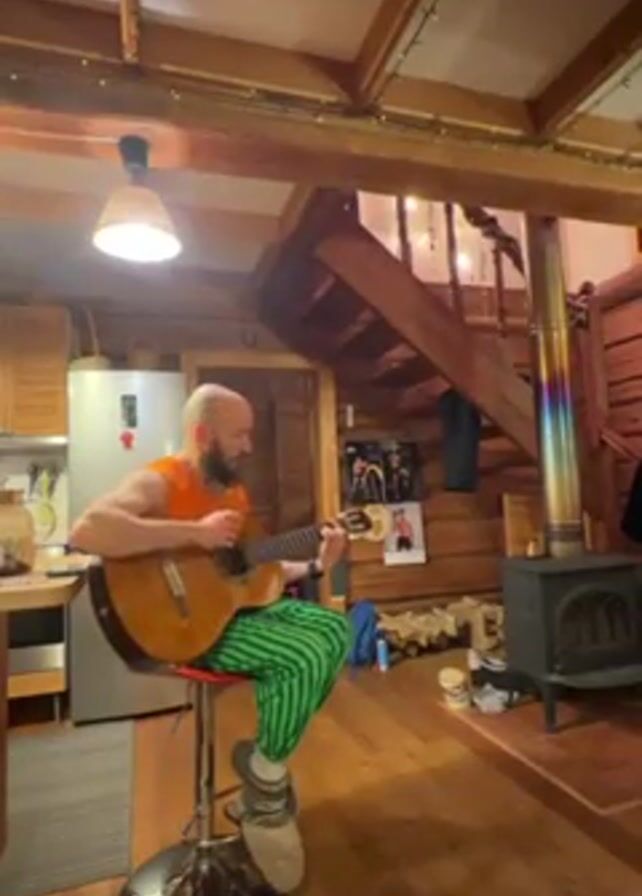 A man is sitting on a red stool playing a classical guitar in a rustic log cabin. The man has a beard and is wearing an orange tank top and green and black striped pants with furry slippers. The cabin has a wooden floor, a wood stove, and a staircase leading to a loft. There are fairy lights strung around the cabin. A kitchen area with a refrigerator is partially visible to the left of the man. The man is singing while playing the guitar.
