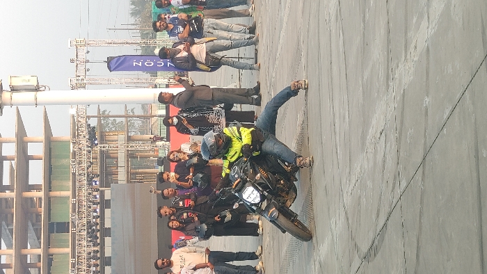 A male individual performs a motorcycle stunt on a flat, light-colored concrete surface in Kanchon, Bangladesh