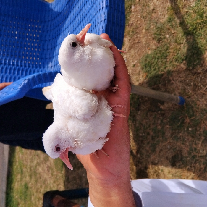 - "Two small, white, fluffy birds, consistent with fledglings, are held in the open palm of an adult's left hand in an outdoor setting in Lassan, Pakistan" by FM-gh1oY2, licensed under CC BY 4.0