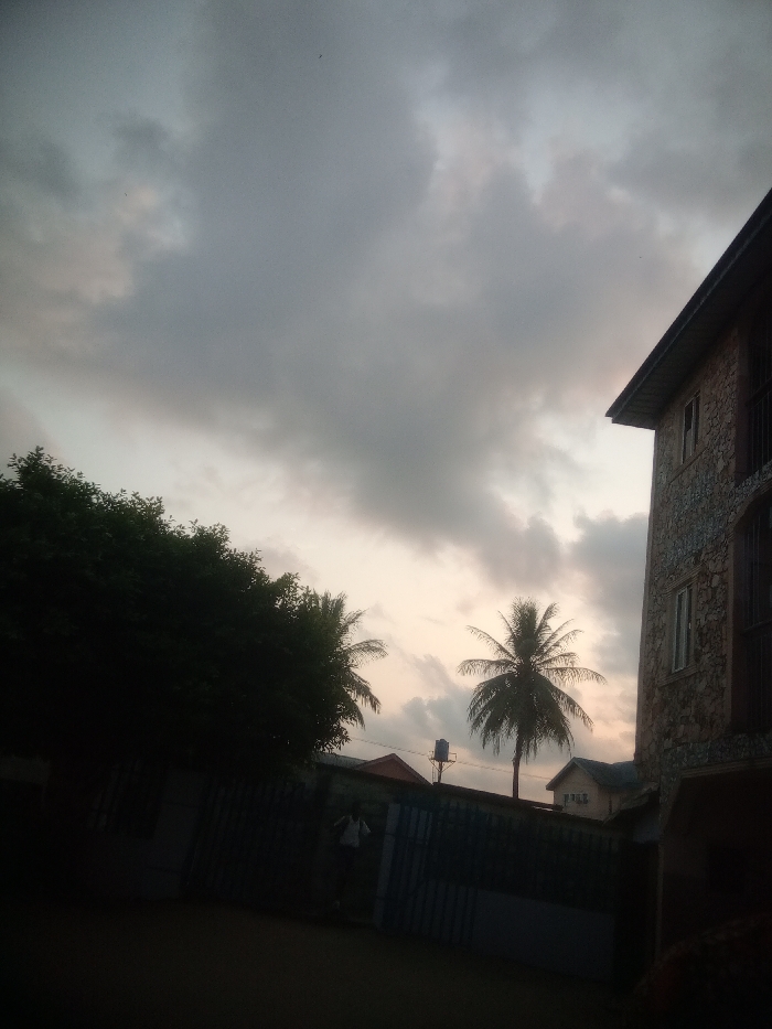 An overcast sky dominates the image, with a hint of light breaking through near the horizon. A two-story building with a stone facade is on the right. Two palm trees rise above a fence in the center. To the left, a dense tree line obscures some of a blue fence. A water tank is visible behind the fence. A person stands in the gate.