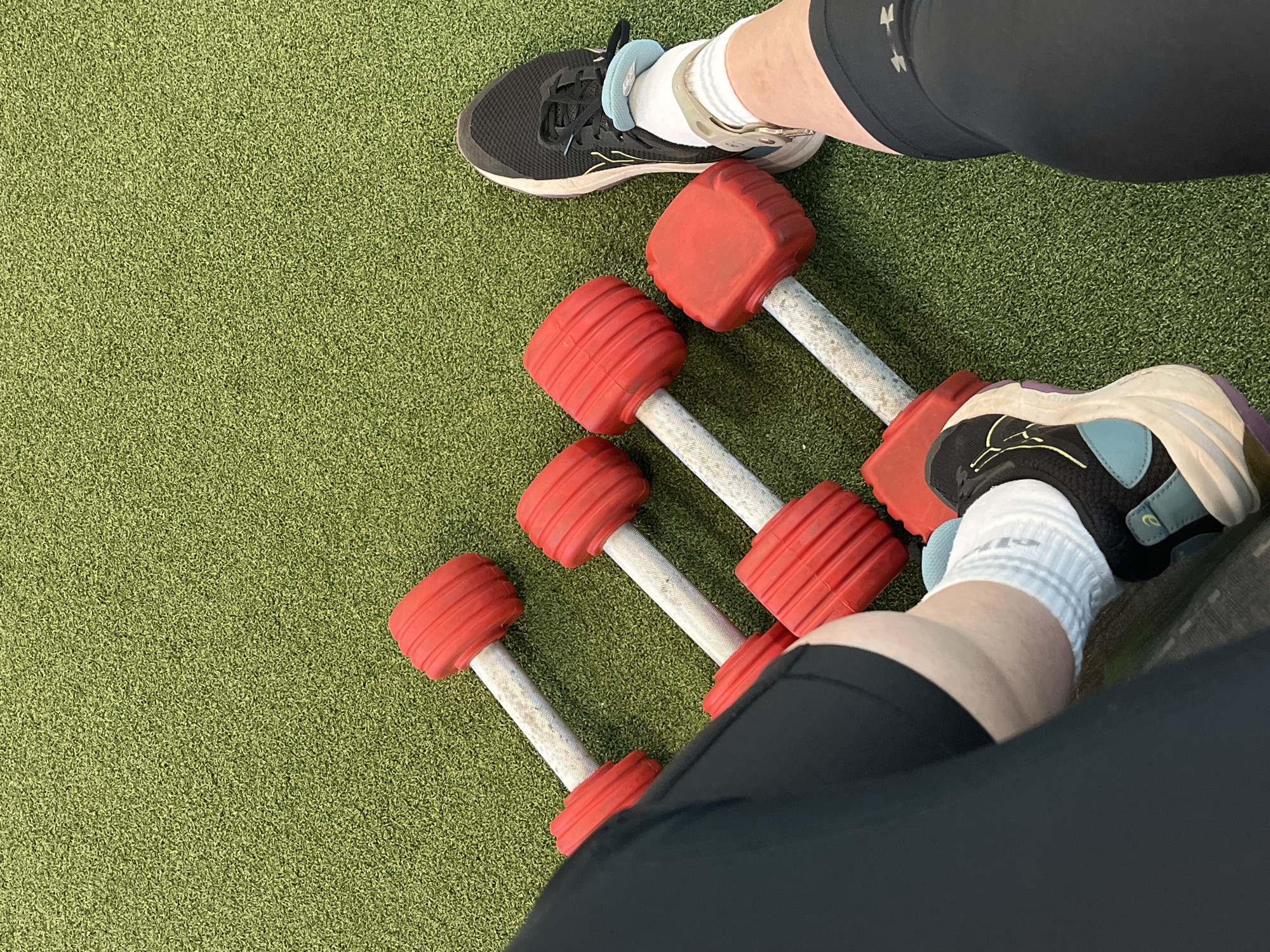 top-down view of a green artificial turf surface with four red dumbbells arranged diagonally. A person in black athletic clothing is visible, with their feet clad in athletic shoes and white socks. One foot is near a black shoe, while the other rests near a tan, black and aqua-trimmed shoe. The location is indeterminate, and the Borough of Runnymede, United Kingdom, cannot be confirmed from the visual information provided.