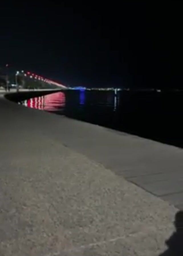 waterfront view at night. The camera pans from a bridge with colorful lights reflecting in the water to a long stretch of waterfront promenade. In the distance, there are blurred lights of a city skyline. No people are clearly visible, though the shadow of someone holding the camera can be seen. The environment is dark, with the only illumination coming from artificial lights.
