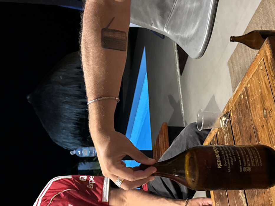 This image depicts a nighttime scene at an outdoor leisure area, likely a resort or private residence, in General Luna, Philippines. In the foreground, a rustic wooden table occupies the lower half of the frame. On the table, a clear plastic cup containing cigarette butts and ashes is visible on the right. A brown glass bottle of "RED HORSE" beer, with condensation visible, is held vertically near its neck by a person's left hand. This individual wears a silver-colored ring on their ring finger and a red and white shirt with an "Expe" logo on the left side, visible on the left edge of the frame. To the right of the beer bottle, another person's right forearm is visible, adorned with a silver chain bracelet near the wrist and a dark, rectangular tattoo resembling a stylized axe or cleaver on the upper forearm. A segment of a grey, possibly fabric, object is partially visible on the far right, suggesting a piece of clothing or accessory worn by this individual. In the background, beyond the table and individuals, a body of water with bright blue illumination, consistent with a swimming pool, extends horizontally. Behind the pool, a dark, conical thatched-roof structure, resembling a hut or cabana, is silhouetted against the night sky. A clear plastic water bottle is also visible standing near this structure. The ground appears to be light-colored paving or concrete, with a beige woven mat or rug partially visible under the table.