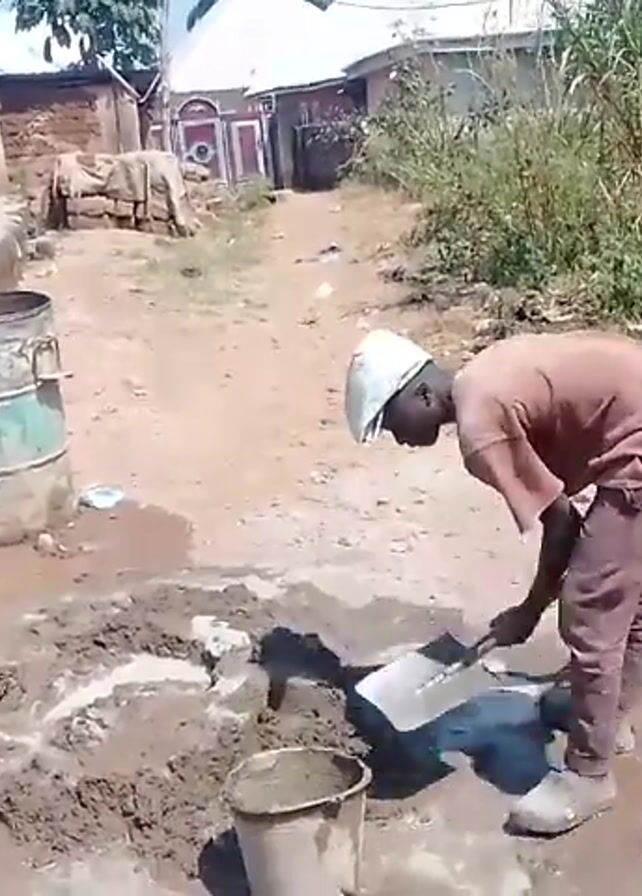 Two men are mixing mud and water with shovels in a dirt clearing. One man is wearing a white hard hat, brown shirt and pants, and closed-toe shoes. The other man is wearing a dark shirt, red shorts, and sandals. Both are bent over and working on a pile of mud and water. There are two metal pails nearby, partially filled with mud. A rusty, empty oil drum stands behind them. The surroundings are a mix of rough, informal structures, with exposed brick and corrugated metal, and overgrown vegetation. The setting appears to be a rural or peri-urban area.