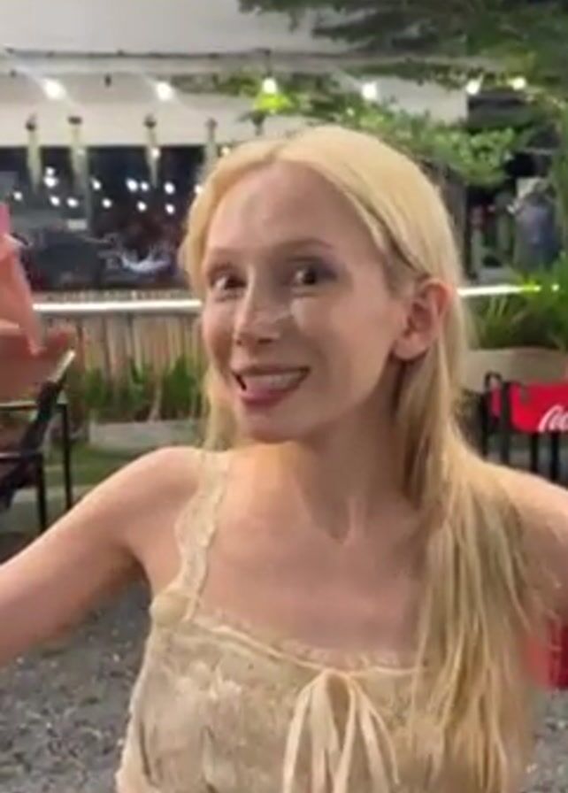 A young, pale-skinned woman with blonde hair is shown in a close-up video