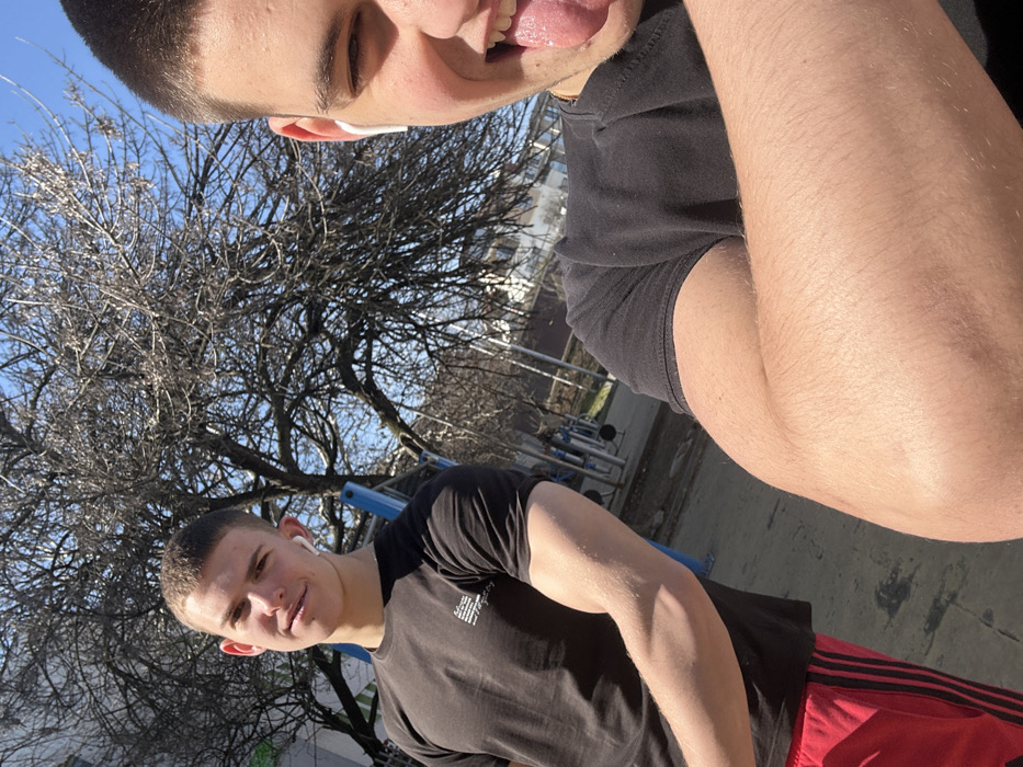 The image depicts an outdoor scene in Kardzhali, Bulgaria, featuring two young adult males under a clear blue sky. The male on the left, with short dark hair, is positioned facing the camera, wearing a black short-sleeved t-shirt with a white logo on the left chest and red shorts with black stripes. He displays his flexed right bicep and has white wireless earbuds in both ears. He maintains a slight smile. The male on the right, partially visible and closer to the camera, appears to be taking the photograph. He has short dark hair, wears a black short-sleeved t-shirt, and has a white wireless earbud in his right ear. His mouth is open, and his tongue is extended in a playful gesture. His right forearm and bicep are visible, indicating a flexed arm. In the background, deciduous trees with bare branches are prominent, suggesting a late winter or early spring season. Blue metal outdoor exercise equipment is visible behind the individuals, indicating a public outdoor gym or park setting. The ground appears to be a mix of earth and possibly paved areas, with sunlight casting shadows.