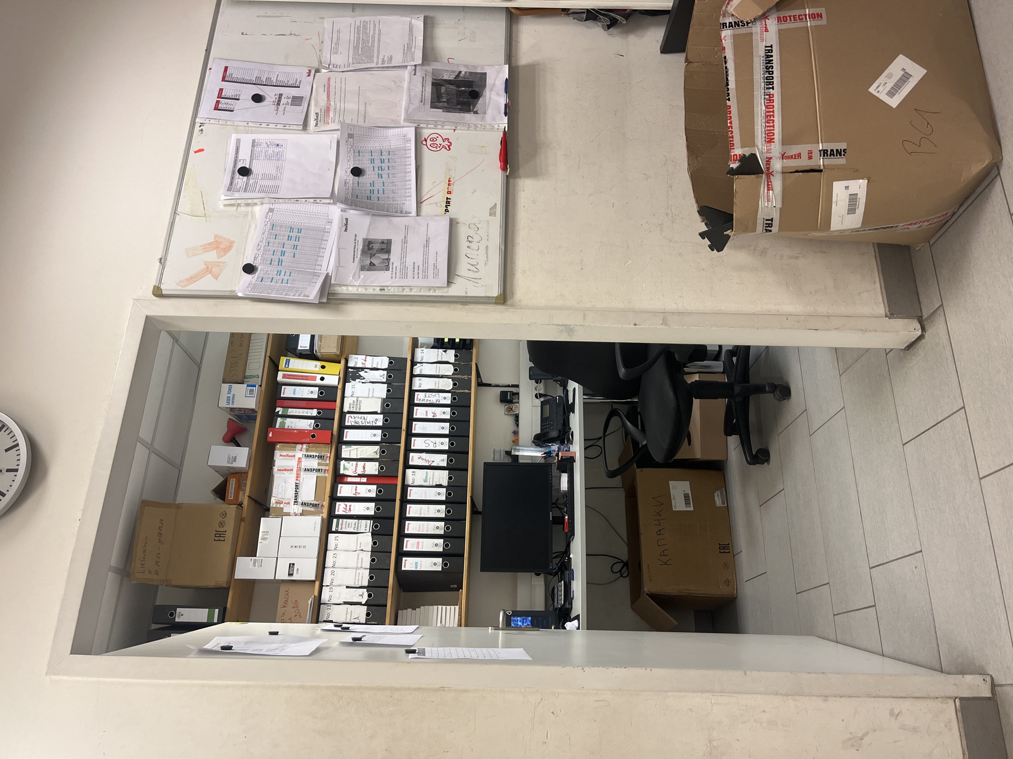 doorway leading into a cluttered office space. On the wall beside the doorway is a clock, partially visible. Inside the office, a large, tall shelving unit is filled with numerous ring binders in black, red, and yellow, along with boxes and containers. A desk runs along the bottom of the shelves, and on the desk are papers, pens, and a computer monitor. An office chair sits behind the desk. To the right of the doorway is a large cardboard box with red tape reading "TRANSPORT PROTECTION". A whiteboard with papers attached is visible above the doorway. "Kapachki" is written on a box in the foreground. "Sofia, Bulgaria" is not explicitly confirmed in the image, but "Liefarschein" suggests a German/European office.