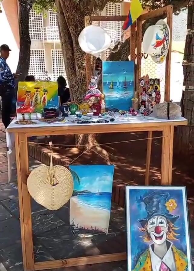 display table in an outdoor setting, possibly an art fair or market. The table is made of wood and has a white top. Various items are displayed on it, including paintings with beach and clown themes, a fan, jewelry, and other handcrafted goods. A Venezuelan flag hangs behind the table. A man in a uniform stands nearby, and other people are visible in the background. The scene is partially shaded by a large tree.