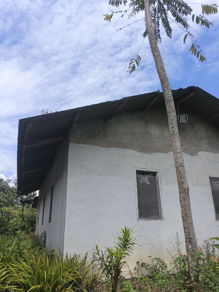 A simple, one-story house with a corrugated metal roof stands against a cloudy sky. The exterior is painted white, with visible areas of unfinished grey concrete. A tall, slender tree trunk partially obscures the building's facade. Two rectangular windows are visible. Overgrown vegetation surrounds the base of the house. A security light is mounted high on the exterior wall.