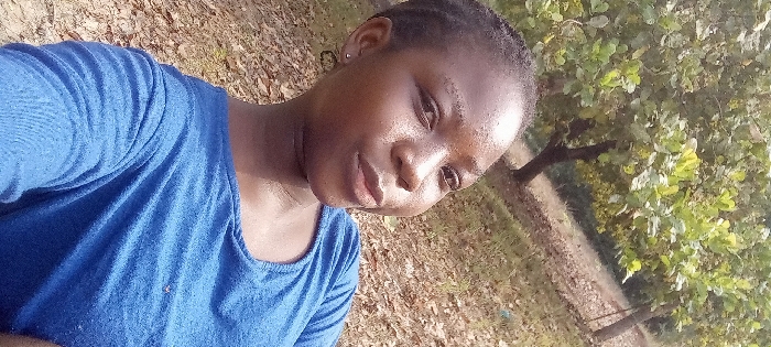 The image presents a female individual with dark skin, her hair styled in small braids, wearing a blue short-sleeved shirt and small metallic earrings. A slight sheen is visible on her face. Her gaze is directed towards the viewer's left. The scene is set outdoors, in what appears to be a natural environment within Konike, Nigeria. The background features multiple trees with green and light green foliage, while the ground is covered with dry leaves and exposed earth. The lighting suggests a daytime environment.