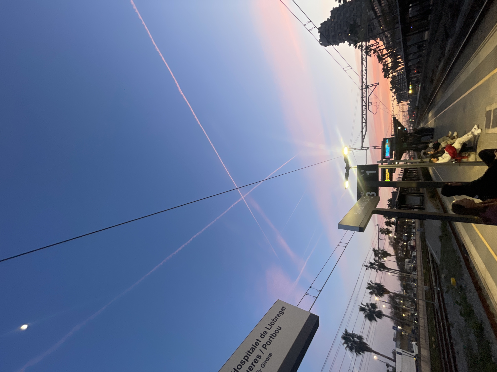 The scene depicts a train station platform in Mataró, Spain, at dusk. The sky transitions from deep blue at the zenith to pale pink and orange near the horizon, with several white-pink contrails forming an "X" pattern and other linear streaks. A crescent moon is visible in the upper left sky. On the platform, approximately seven to ten individuals are visible, predominantly seated on light-colored benches. They appear to be waiting for a train. One person in the foreground, partially visible on the far left, has dark hair. Another individual, closer to the center, wears a white hoodie and light pants, with a red bag placed beside them. The platform is marked with a yellow safety line along its edge. Multiple sets of train tracks run parallel to the platform, laid on ballast. Overhead, a network of electrical wires and catenary support structures spans the tracks. Platform lighting fixtures are illuminated, casting light onto the waiting area. A prominent white overhead sign on the left displays partial text, including "Hospitalet de Llobregat," "eres / Portbou," and "Girona," indicating train destinations. Another smaller sign on the platform designates "via 1." In the background to the left, a line of palm trees is visible, with vehicles including a white van on an adjacent road or parking area. To the right, more palm trees are present, alongside a distinctive, dark, multi-story building with an irregular, terraced architectural design. Further down the tracks, additional railway infrastructure and distant lights are discernible.