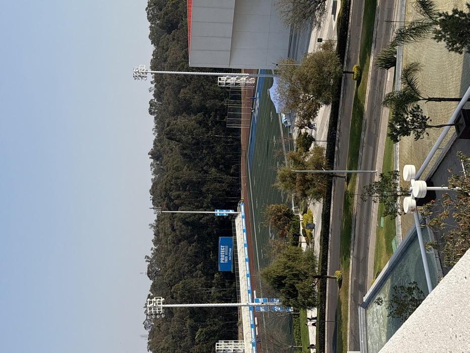 - "An elevated perspective showcases a sports field with blue and green markings, bordered by a dense forest on one side" by FM-yooU93, licensed under CC BY 4.0