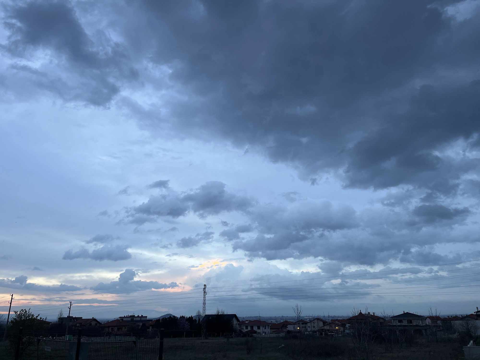 The image displays an exterior landscape of the city of Branipole, Bulgaria, at dusk or dawn. The sky occupies the upper two-thirds of the frame and is heavily covered by dense, dark gray and blue-gray clouds. A faint strip of lighter blue, mixed with subtle yellow-orange light, is visible along the horizon, predominantly towards the left-center, indicating the position of the sun. The lower third of the image shows the townscape. In the immediate foreground, a dark, uncultivated area of ground with sparse, bare vegetation is present. A dark metal fence runs partially across the bottom of the frame. Within the city, numerous residential buildings are visible, mostly houses featuring red or dark-tiled roofs. These structures are interspersed among deciduous trees, many of which are bare, and some evergreen foliage. A tall, metallic lattice tower stands vertically slightly left of the image's center. Multiple utility poles and a network of overhead power lines traverse the scene horizontally. Distant hills or mountains are faintly discernible on the far horizon, partially obscured by atmospheric haze. No individuals are present. The scene is illuminated by dim, ambient light.