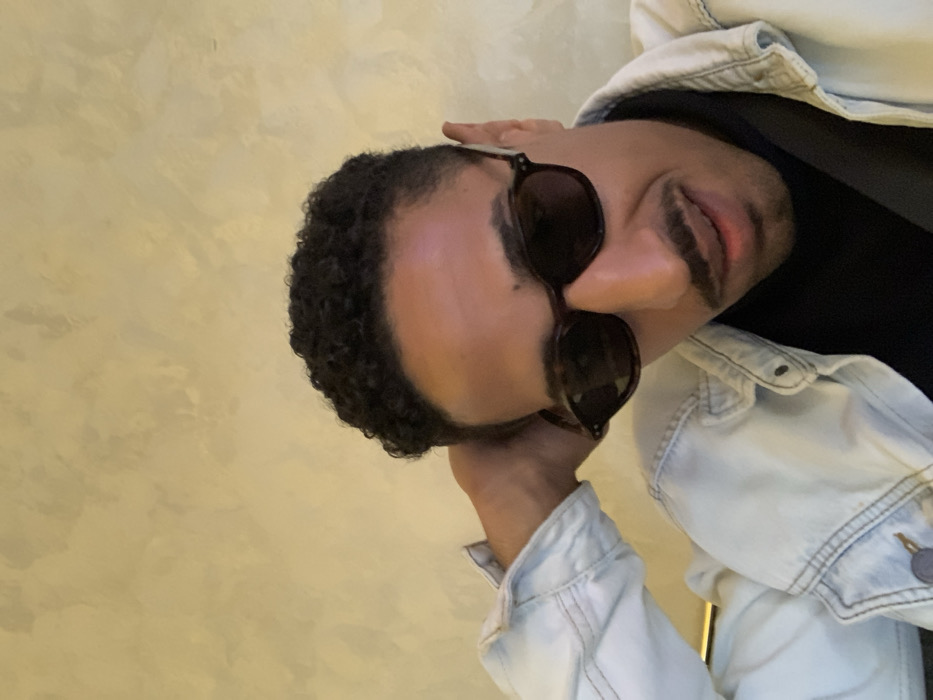 An adult male is depicted in a close-up, slightly angled portrait. The subject has dark, curly hair and a mustache. He wears dark-lensed, tortoiseshell-patterned sunglasses, a light-wash denim jacket, and a dark undershirt. His right hand is positioned behind his neck with the elbow raised. His head is tilted slightly, and his mouth is slightly ajar. The background consists of a uniformly light beige, textured wall, indicating an indoor setting. The scene is located in Tangier, Morocco.