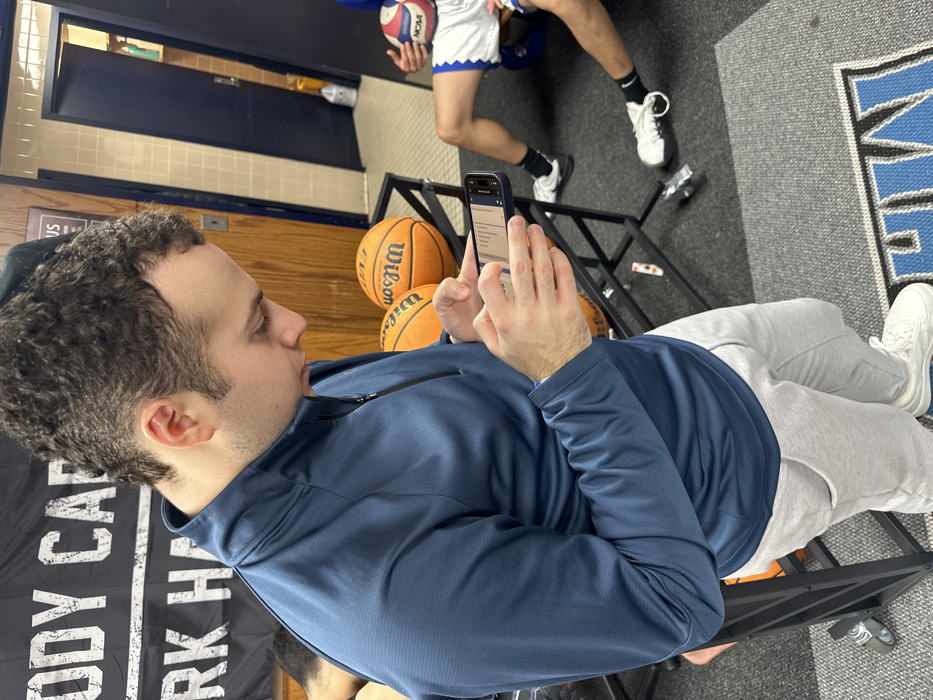 A man in a blue shirt and grey sweatpants uses his smartphone indoors. He is situated beside a metal rack holding several orange Wilson basketballs. Another person is partially visible behind the rack, holding a volleyball, and wearing a blue and white basketball uniform with white sneakers. A black banner is partially visible on the left, with white lettering. A portion of a basketball team logo is on the ground, and a blue door is in the background.