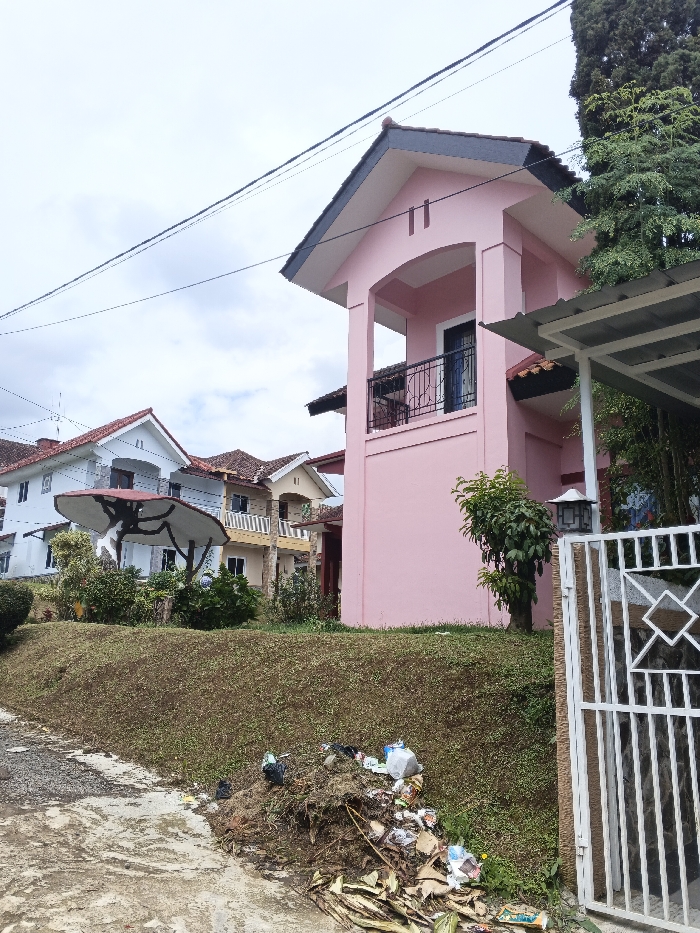 A pink two-story house with a balcony stands on a grassy hill. Other houses, one with a white exterior and a dark-colored shade covering an outdoor seating area, are visible nearby. A large pile of trash, including plastic bags and discarded items, sits at the bottom of the hill near the road. A white metal gate is partially visible in the foreground. Overcast sky is above.