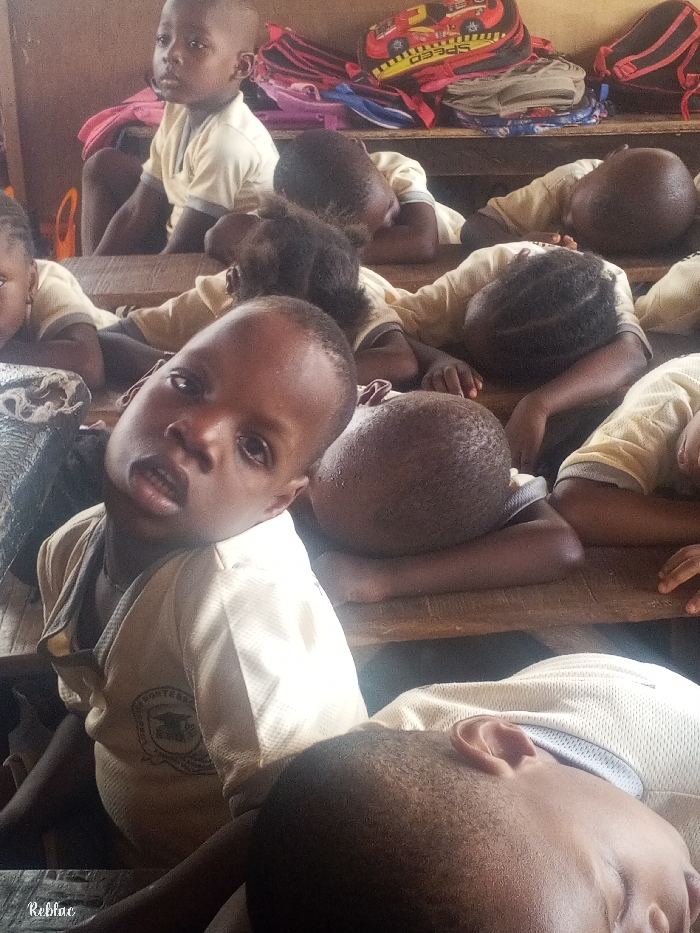 The image captures an indoor scene in Ukwu-Abwa, Nigeria, depicting a classroom setting