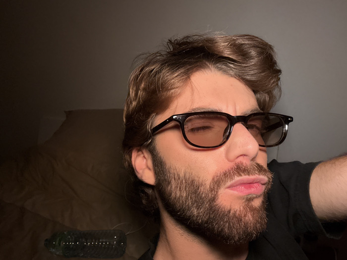 A man with brown hair and a beard is wearing black-framed glasses with tinted lenses. His lips are slightly puckered, as if posing for a kiss. The background features a dark room with a visible bed and a discarded plastic bottle. The lighting appears low and creates shadows, enhancing the mood.
