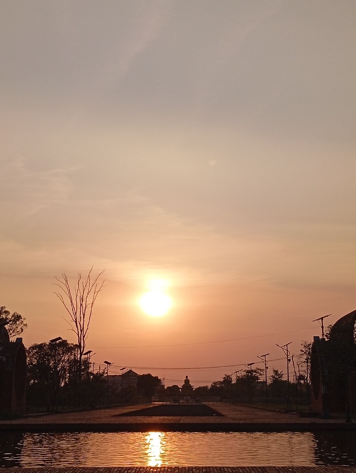 The image displays an outdoor scene captured at sunset in Parsa, Nepal. The upper two-thirds of the frame are dominated by a clear sky, transitioning from a warm orange-pink at the horizon to a pale greyish-blue overhead. The sun, a prominent bright white-yellow orb, is centered in the lower sky, emitting a strong glare. In the immediate foreground, a body of calm water, possibly a pond or canal, spans the width of the frame, its surface reflecting the sunlight as an elongated, shimmering golden path. A dark, brick-like edge borders the water in the closest proximity to the viewer. Beyond the water, the landscape is presented in silhouette against the bright sky. A tall, bare deciduous tree with thin branches is visible on the left side of the frame. Centrally, directly beneath the sun, stands a dark statue, identifiable as a seated Buddha on a tiered pedestal, located within an open, flat area resembling a park or plaza. This area is flanked by multiple streetlights or solar-powered lights, each featuring a panel. On the far left and right edges of the midground, dark, arch-like architectural structures are partially visible. Distant buildings are faintly silhouetted on the horizon line. No individuals or specific actions are discernible in the scene.