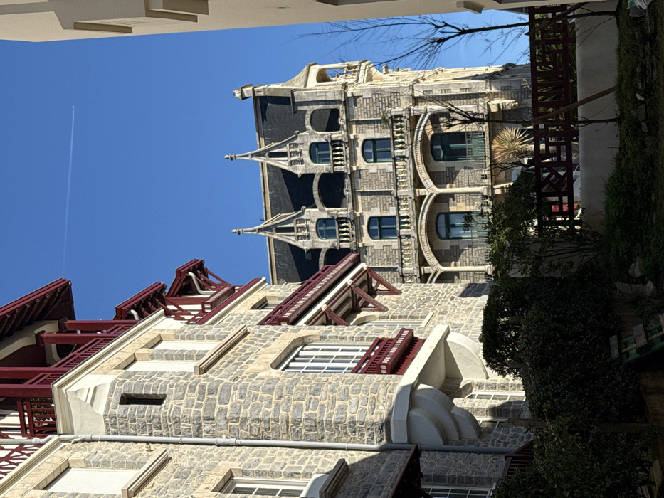 The image depicts an urban landscape in Biarritz, France, dominated by three multi-story buildings under a clear blue sky. In the foreground on the left, a building constructed of irregularly shaped light grey and beige stone blocks features multiple white-framed windows, some with external roller shutters. Dark red wooden balconies and eaves with supporting brackets are visible, along with white rain gutters. The central background features a more ornate stone building with a dark grey slate roof adorned with three prominent spired dormers. This structure exhibits multiple levels of green-framed windows and balustraded balconies, some supported by arches, and an octagonal tower on its right side with an open archway. A plain, light-colored wall of a third building is partially visible on the far right edge. The sky above is bright blue, containing a faint white contrail. The lower portion of the scene is shadowed, revealing dense green shrubbery, two slender bare deciduous trees on the right, and a segment of a reddish-brown wooden fence. A small, light green wooden ladder or step is visible lying on the ground in the lower left shadowed area. No individuals or active interactions are present.
