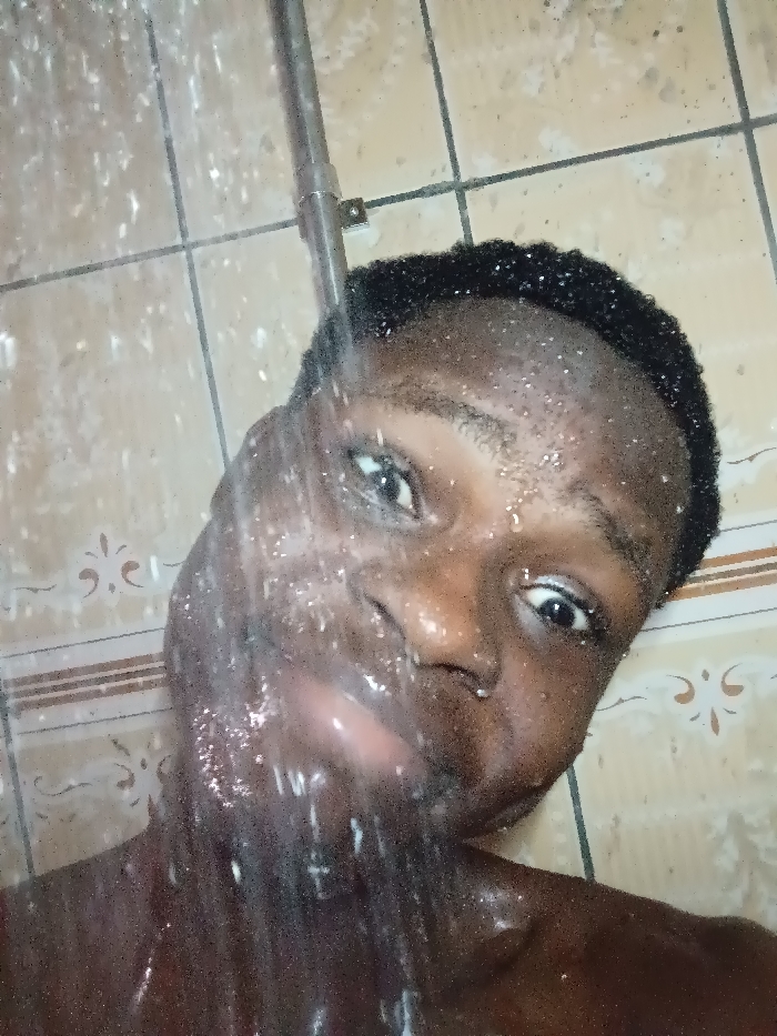 A person of color takes a selfie in the shower. Water streams over their face, eyes open, and a slight smile is visible. The background is tiled in a neutral tone with decorative floral patterns. A metal shower pipe is situated at the top. The individual's head and upper body fill most of the frame.