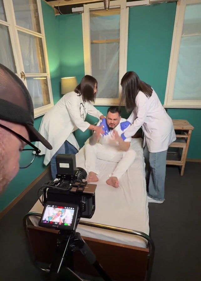 A cameraman films a scene in a room with teal walls, a bed, and two women in white lab coats. The cameraman wears a black hat and glasses. The camera is on a tripod and pointed at the bed. A man lies on the bed in white clothing, restrained by the two women. The room has three windows and an ornate chandelier. The scene appears to be part of a video shoot.