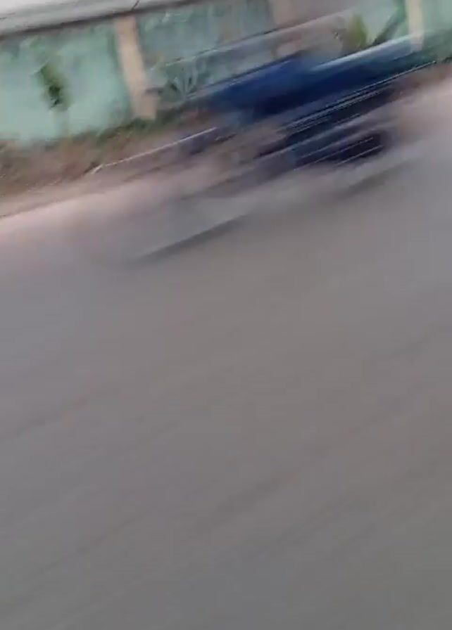 view from a moving vehicle driving on an asphalt road. On the side of the road is a light green concrete fence with columns and some greenery. In the first part of the video, someone walks past on the sidewalk. Later, another person walks past the camera on the sidewalk. The sky is overcast.