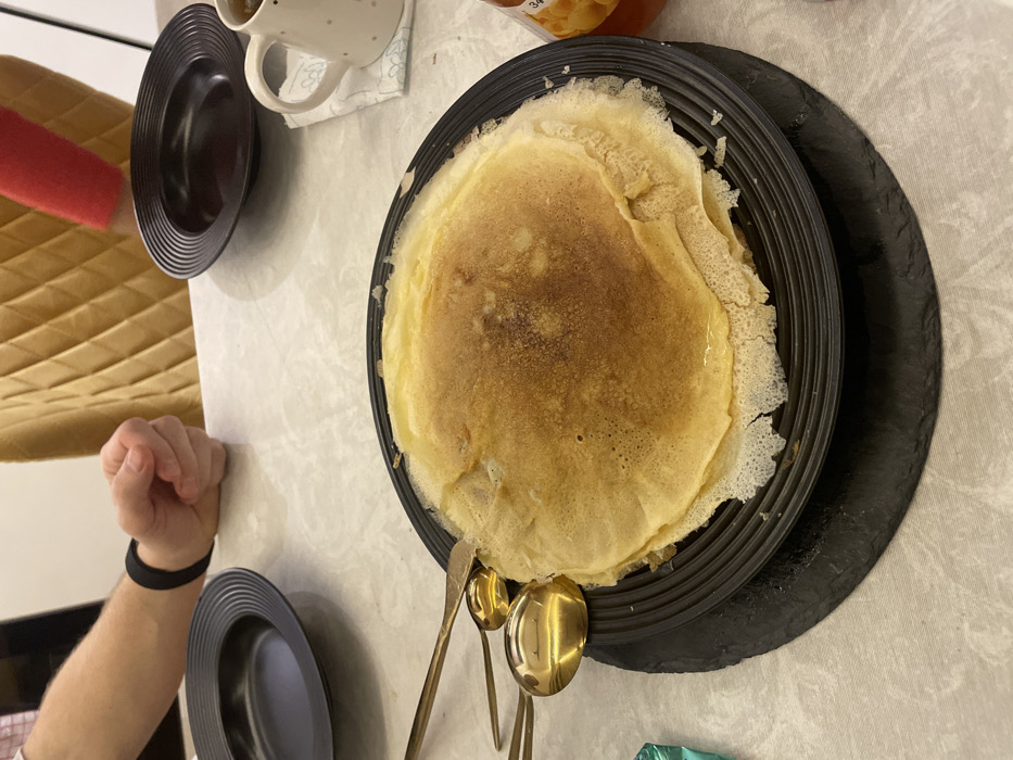 A stack of crepes sits on a black plate atop a dark slate placemat. Golden serving spoons rest near the edge of the plate. Nearby, two black bowls flank a white mug adorned with polka dots. An arm with a black wristband rests on the table next to the bowls. A tan chair with a red cushion is partially visible in the background. The tabletop has a mottled light pattern.