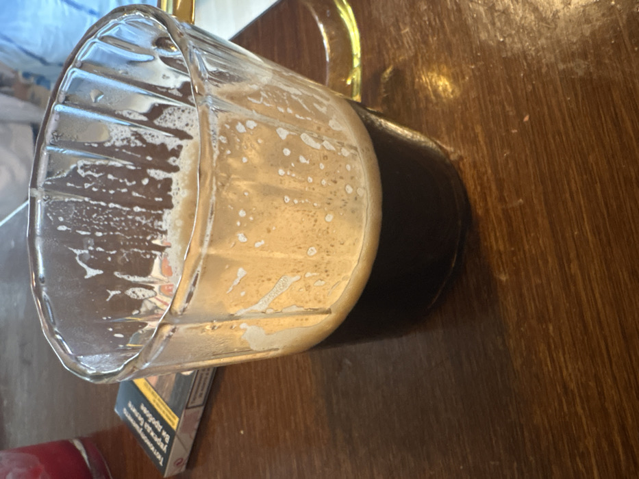 The scene depicts an indoor setting, likely a cafe or bar, located at an unspecified address within the city of Kempten (Allgäu), Germany. The primary subject is a clear, faceted glass mug, approximately one-third full of a dark brown liquid topped with a substantial layer of light brown foam. The foam adheres to the interior walls of the mug, indicating partial consumption of the beverage. The mug rests on a dark brown, polished wooden table exhibiting visible grain. To the left and slightly behind the mug, a white and black cigarette pack is visible, displaying text in Cyrillic script, specifically a health warning in Bulgarian. Further to the left, a portion of a red-colored glass or drink is present. The background shows blurred elements, including what appears to be a person wearing a light blue top. There are no direct interactions captured. The environment is illuminated by ambient light, creating reflections on the glass mug and table surface.