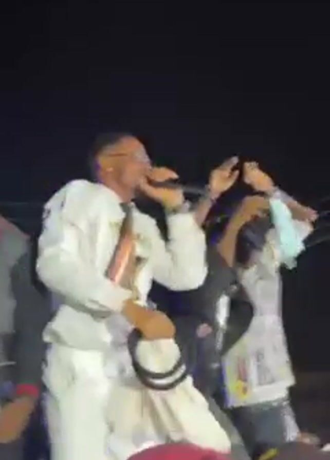 A brightly lit outdoor stage hosts a performer dressed in a white suit, tie, and glasses, who sings into a microphone while interacting with others on stage. The performer moves with energy and appears to be the center of attention. He is surrounded by several individuals, some of whom are also dressed in white, and others in black jackets or casual attire. These people seem to be part of his entourage or support team, and they dance and gesture along with his performance. A crowd is visible in the foreground, obscured by darkness, with a person wearing a pink shirt closer to the camera. The background is dark, indicating that the performance is taking place at night. The lighting from the stage illuminates the performers, creating a contrast against the dark sky.