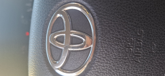 A forensic examination of the image reveals the central hub of a vehicle's steering wheel, located in Casablanca, Morocco. The primary subject is a chrome-plated Toyota logo, centrally affixed to a textured, black SRS airbag cover. Below the logo, the words "SRS AIRBAG" are embossed into the black material. In the blurred background, above the steering wheel, a segment of the vehicle's dashboard is visible, featuring a single, illuminated red indicator light. No individuals, actions, or specific interactions are depicted. The scene is static, portraying the interior of a vehicle under ambient lighting conditions.
