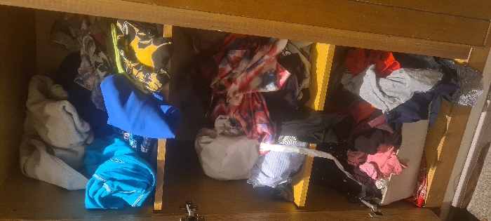 The image displays the interior of an open wooden cabinet or wardrobe with three shelves, located in Unknown, Unknown. Each shelf is densely filled with various articles of clothing, appearing unorganized. The top shelf contains folded light-colored garments, a bright blue item, a dark blue item, and a yellow and black patterned item. The middle shelf holds a white garment, a striped light blue garment, a hanging white fabric strip, and a red, white, and black patterned garment. The bottom shelf features a white plastic bin overflowing with pink and dark-colored clothing, with additional scattered garments including gray, red, dark blue, and a silver-sequined item. The cabinet interior and shelves are light brown wood, and the outer frame is a darker brown. Two metal hinges are visible on the left side of the frame, indicating the door is open. No individuals are present.