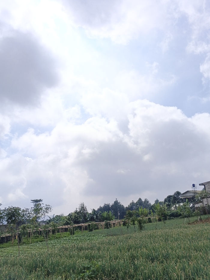 This vertical outdoor photograph depicts an agricultural landscape located in Maw Hit, Myanmar, under a partly cloudy sky. The upper two-thirds of the image are occupied by a light blue sky with numerous white and grey cumulus clouds; a bright, possibly sunlit, spot is visible in the upper center. The foreground and lower midground consist of a large, green cultivated field, presenting distinct rows of uniform, low-growing plants, consistent with crops such as onions or leeks. This field gently slopes upwards from the lower left to the right. Behind this primary field, a series of light-colored wooden trellises or support structures extend horizontally across the midground, indicating further agricultural development. Scattered smaller trees are visible near these structures. A line of dense green trees, some appearing coniferous, forms a natural boundary in the background. On the far right, partially obscured by trees, a structure with a light-colored roof and walls is visible, topped by a distinct blue elevated water tank. No individuals are present within the frame.