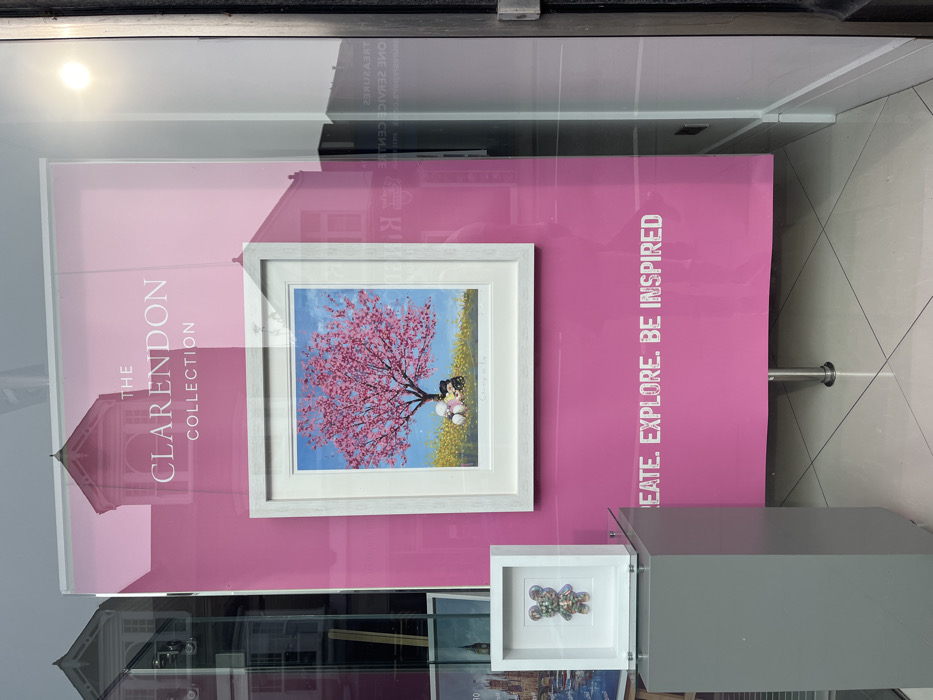 The image depicts a storefront window display at 11 High Street, Esher, in the Borough of Elmbridge, United Kingdom, specifically a Clarendon Fine Art gallery. The interior display features a large, bright pink banner serving as a backdrop. "THE CLARENDON COLLECTION" is printed in white capital letters at the top of the banner, and "CREATE. EXPLORE. BE INSPIRED" is printed in white capital letters at the bottom. The banner is supported by two visible chrome posts at its base. Two artworks are displayed. A larger, square-format painting in a white wooden frame is centrally positioned against the pink backdrop. The painting depicts a vibrantly pink-blossomed tree in a field of yellow flowers under a bright blue sky. Two stylized figures, one light-colored and one darker, are seated side-by-side beneath the tree. The artist's signature, "Gary Walton," is visible at the bottom center of the painting. To the left of the main painting, a smaller, white-framed, square-format artwork rests on a dark grey rectangular pedestal. This piece contains a three-dimensional, multi-colored mosaic-style teddy bear figure on a white background. The reflective glass window captures elements of the external environment. A prominent reflection in the upper left shows a multi-story building with light-colored masonry and an ornate cupola or turret. Other reflections include reversed text from adjacent businesses, such as "TREASURES" and "ONE SERVICE CENTRE," visible on the right side of the glass. A bright sun glare is present in the upper right corner of the window. The interior floor visible is composed of light-colored square tiles.