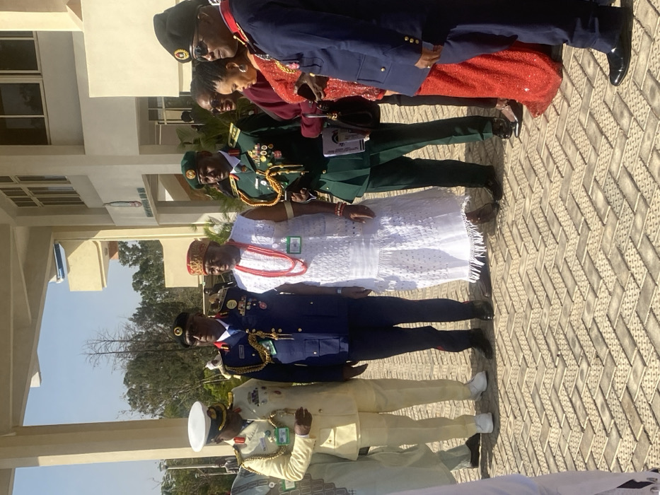 An outdoor scene depicts a group of eight individuals gathered on a paved area in front of a modern building at the National Veterinary Research Institute (NVRI) in Vom, Nigeria. The ground is covered with light-colored rectangular pavers arranged in a herringbone pattern. The building in the background features multiple stories, columns, and windows, with "NATIONAL VETERINARY RESEARCH INSTITUTE VOM" visible on its facade. The sky is clear blue, indicating bright daylight. From left to right: 1. A person partially visible, wearing light green traditional attire. 2. A man in a light cream military or naval uniform with a white peaked cap, multiple medals and ribbons, and a green identification badge. 3. A man in a dark blue military or police uniform with a black peaked cap, numerous medals and ribbons, a red and gold aiguillette, and a green identification badge. 4. A man in white embroidered traditional attire, including a long garment and a red beaded cap, a prominent red beaded necklace, and red beaded wristbands. He wears a green identification badge. 5. A man in a dark green military uniform with a green beret, multiple medals and ribbons, a yellow and gold aiguillette, and a green identification badge. He holds a small black device in his left hand. 6. A woman in a dark red top and sunglasses, looking right. 7. A woman in a sparkling red dress with a beaded necklace, holding a small black device. 8. A man partially visible on the far right, wearing a dark blue uniform with a red collar detail and sunglasses, facing right. The individuals appear to be posing for a photograph or observing an event to their right. No active interactions are clearly visible.