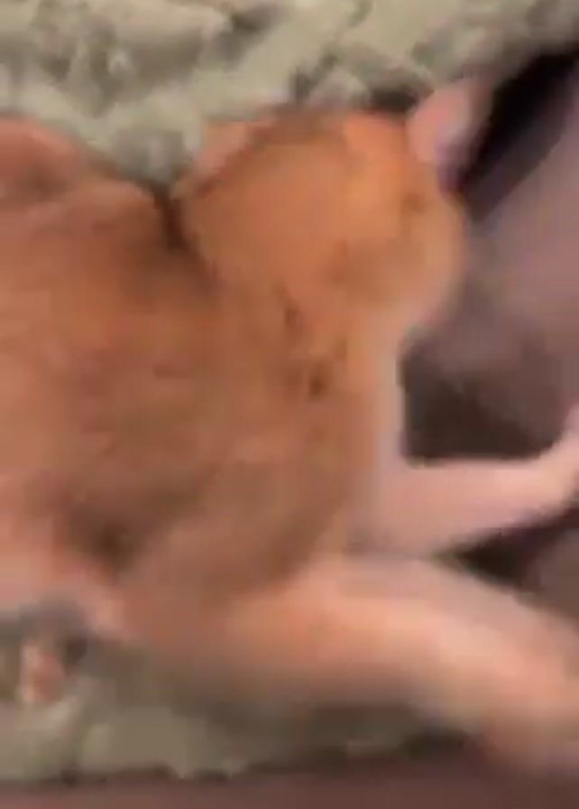 - ". The video shows an orange cat, possibly a British Shorthair, on a tan-colored couch with a green blanket. The cat is initially partially under the blanket. It walks to the side of the couch, where a blue bed is, and appears to be sniffing something. The floor is wood." by FM-aQUtB3, licensed under CC BY 4.0