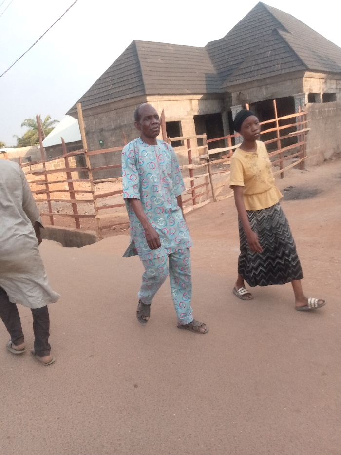 The scene depicts three individuals walking on an unpaved, reddish-brown road in Akwanga, Nigeria. On the left, partially visible with their back to the camera, is an individual wearing a light-colored tunic over dark trousers and sandals. In the center, an older male, with a light complexion and short hair, walks forward, wearing a light blue dashiki-style tunic and matching trousers patterned with red and blue circles, along with brown sandals. To his right, a younger female, with a dark head covering, walks forward, wearing a yellow short-sleeved top, a long black skirt with a white zigzag pattern, and silver slide sandals. All three individuals are generally oriented towards the right side of the frame. In the background, a partially constructed building with concrete block walls and a dark, completed shingled roof is visible. A temporary fence made of horizontal wooden poles separates the road from the construction site. A palm tree is partially visible beyond the fence on the left. The sky is bright and clear.