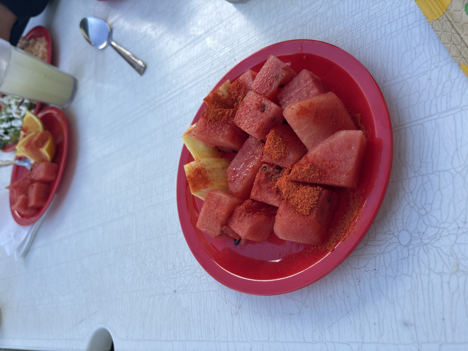 - "A red plate holds diced watermelon and pineapple sprinkled with chili powder" by FM-Yy1EH3, licensed under CC BY 4.0