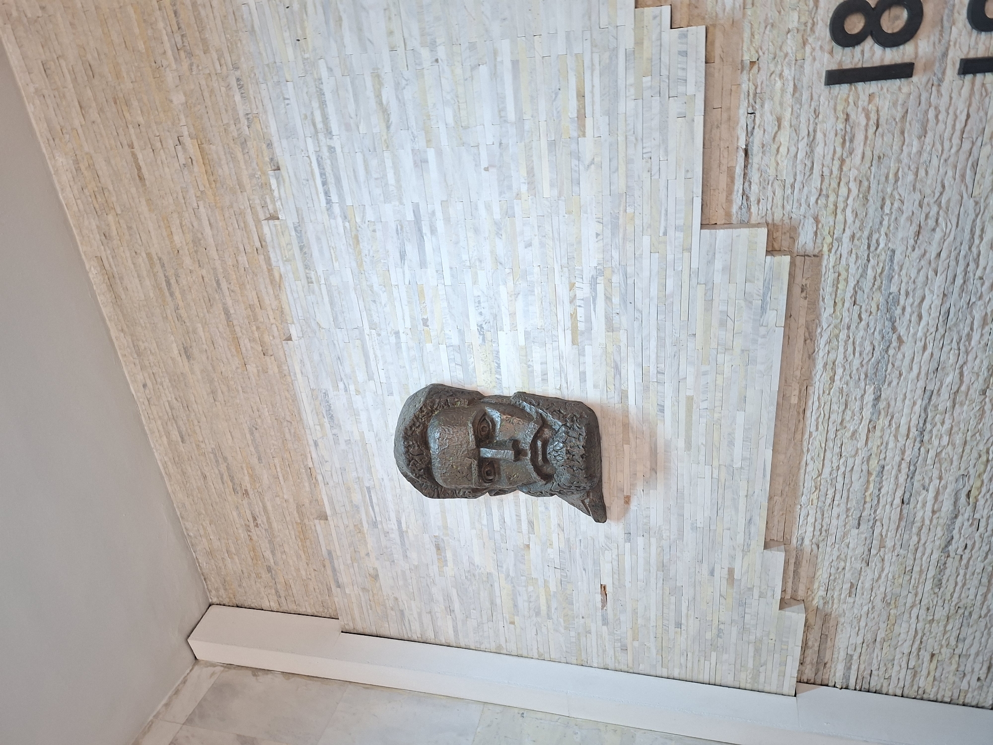 bronze bust of a man mounted on a wall covered in vertically-oriented, narrow tiles of varying off-white shades