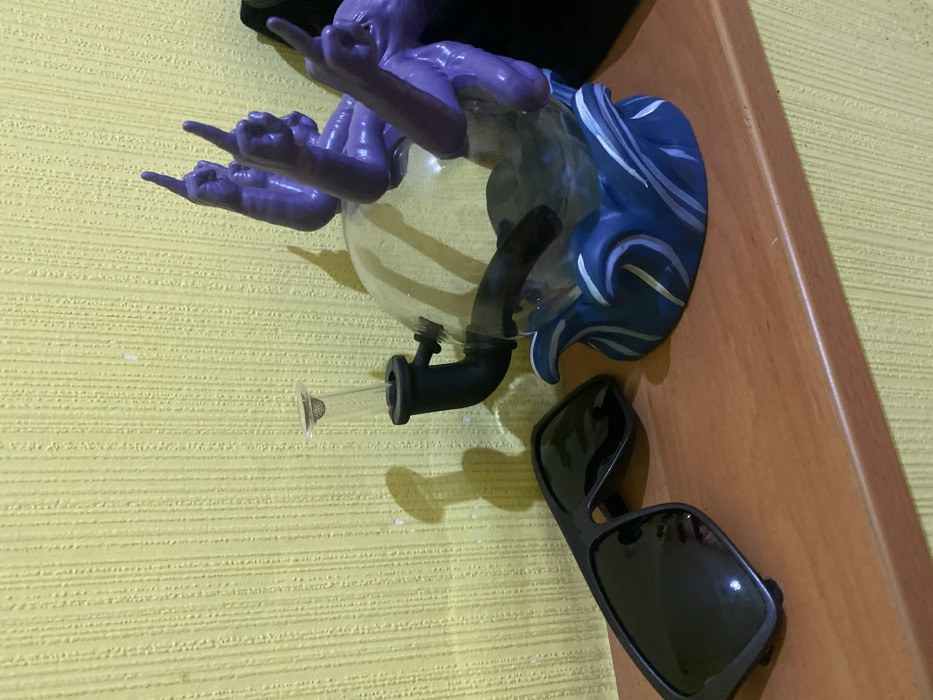 The scene depicts an indoor environment in Krasnodar, Russia. On a light brown wooden surface, a multi-component water pipe, commonly referred to as a bong, is positioned to the right. This bong features a clear spherical glass chamber supported by a dark blue base adorned with white wave-like patterns. From the upper section of the chamber, multiple purple, tentacle-like appendages emerge, each terminating in a hand gesture displaying two extended fingers. A black downstem is inserted into the glass chamber, to which a clear glass bowl with a visible screen filter is attached, oriented upwards. To the left of the bong, a pair of black, rectangular-framed sunglasses rests on the wooden surface. The background consists of a yellow, textured wallpaper with vertical striations, upon which shadows from the objects are cast. No individuals are present in the image.