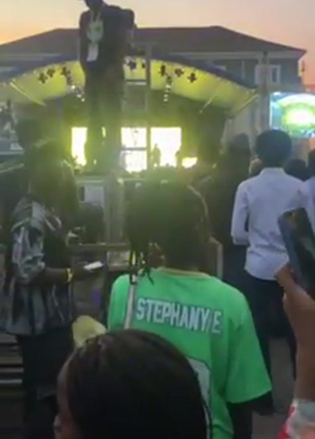 crowd of people watching a performance on a stage. The stage is well-lit with bright white and blue lights. A man in a dark outfit and a bucket hat stands on top of the stage, looking down at the crowd. He has a lanyard around his neck. The crowd is diverse, with people of different ages and clothing styles. One person is wearing a bright green shirt with "STEPHANY E" printed on the back. The video is taken from the perspective of someone in the crowd. The sky is a gradient of colors, suggesting it might be sunset. There is a building visible in the background behind the stage. There is a metal fence in front of the crowd. The music is audible and seems to be upbeat.